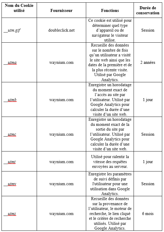 THESE COOKIES CAN ALSO BE DEPOSITED BY THIRD PARTIES. IN THIS CASE, WAYNIUM DOES NOT HAVE ANY POWER TO SET THE PARAMETERS OF THESE COOKIES. YOU SHOULD CONTACT EACH OF THESE THIRD PARTIES TO OBTAIN MORE INFORMATION ON HOW THEY USE COOKIES.